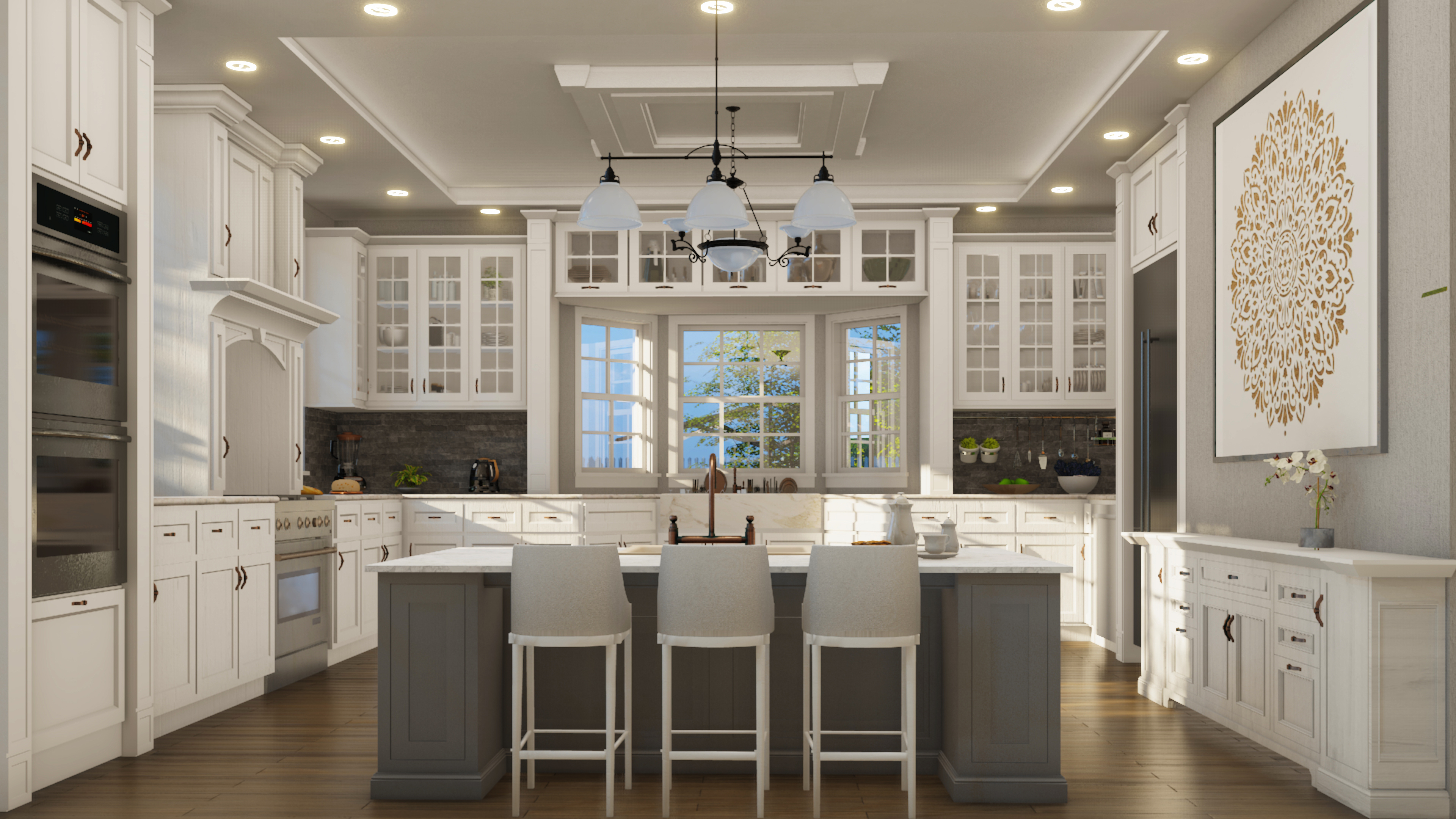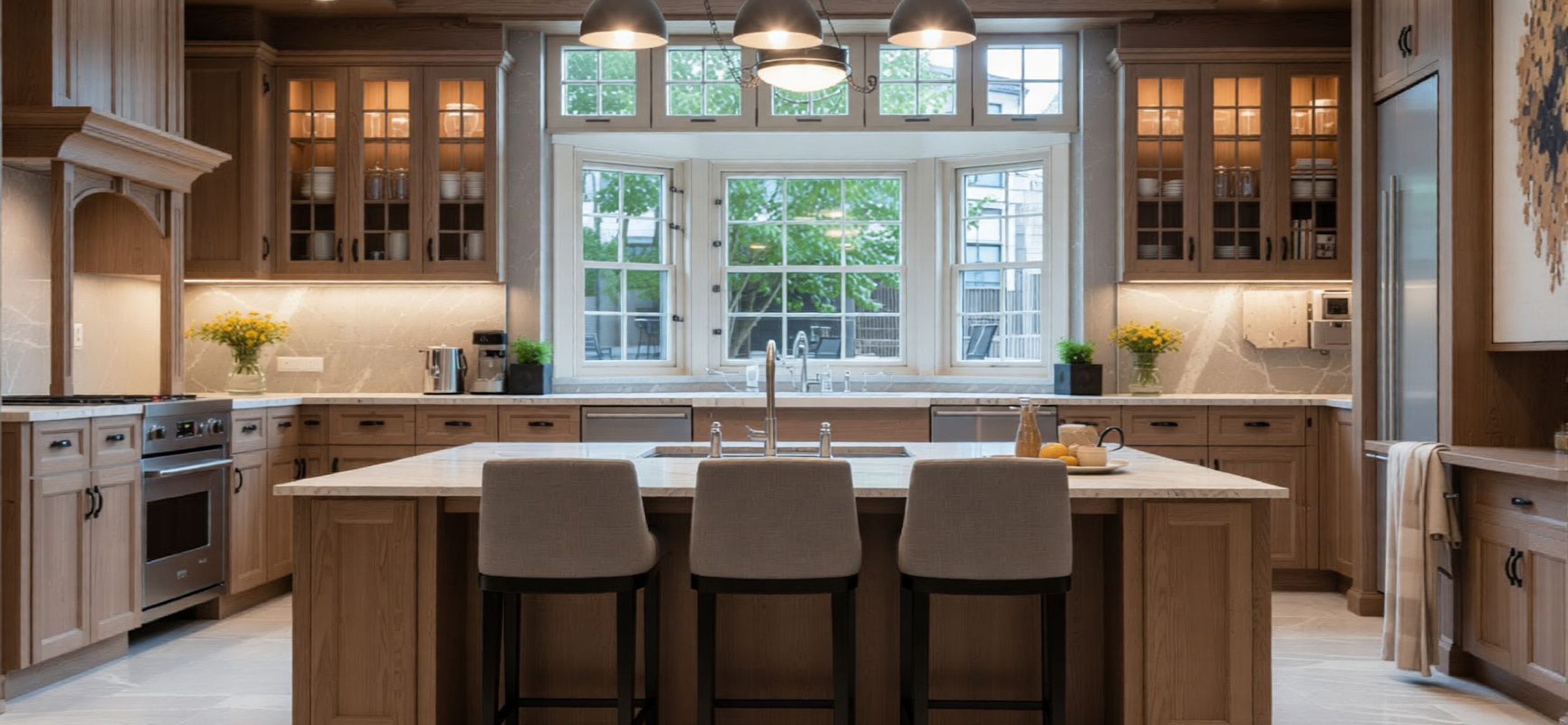 This kitchen was designed from the ground up to bring classic elegance into a modern home. Every element from the detailed cabinetry to the warm bronze hardware and natural stone was chosen to create a refined and welcoming atmosphere.