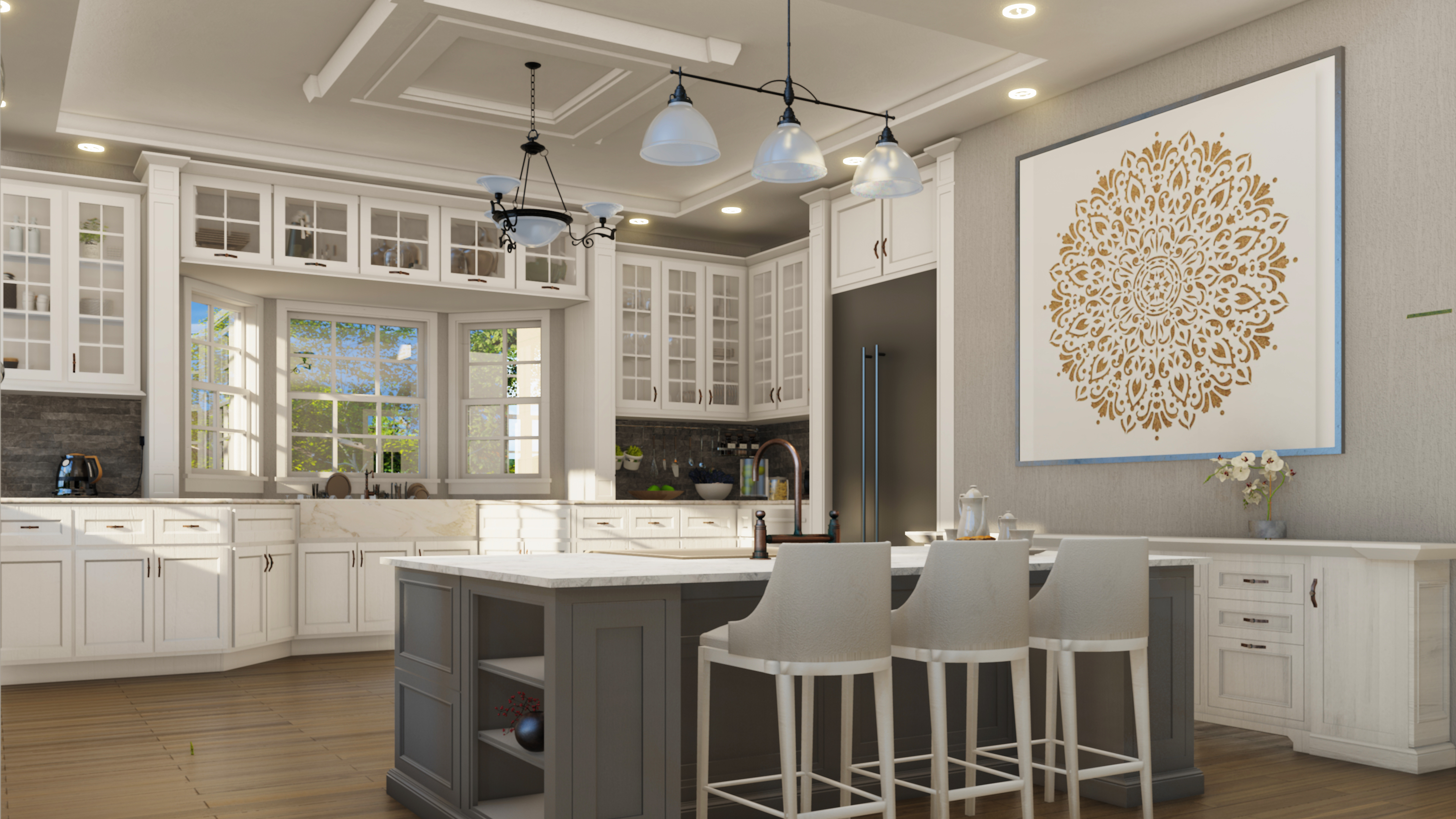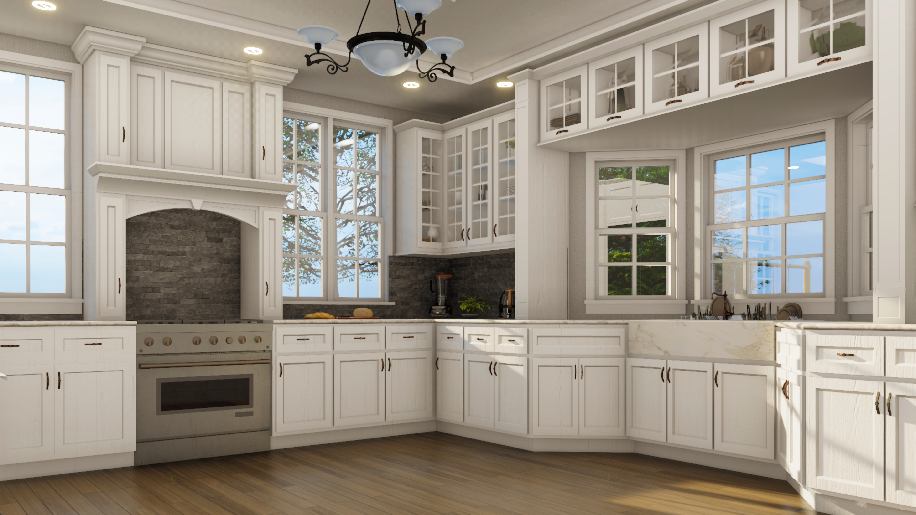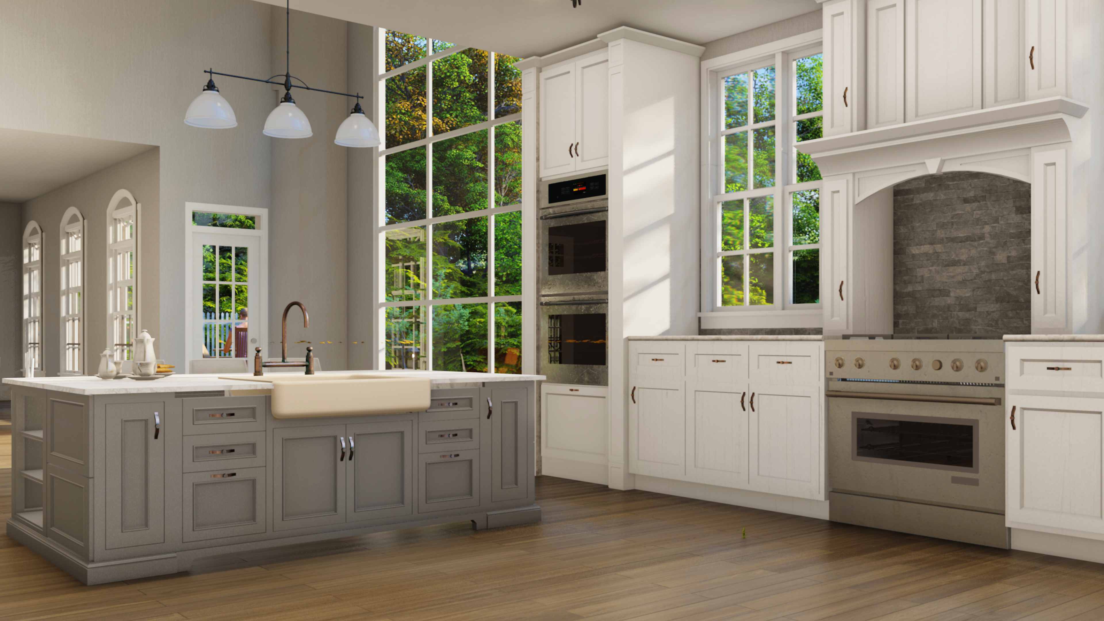 Natural light floods the space, emphasizing the soft contrast between the white cabinets and the gray island. A functional layout with an apron-front sink, dedicated cooking zones, glass-front uppers, and seamlessly integrated appliances ensures effortless daily use. level of engineering expertise, and modern design quality to homes across Southern California.