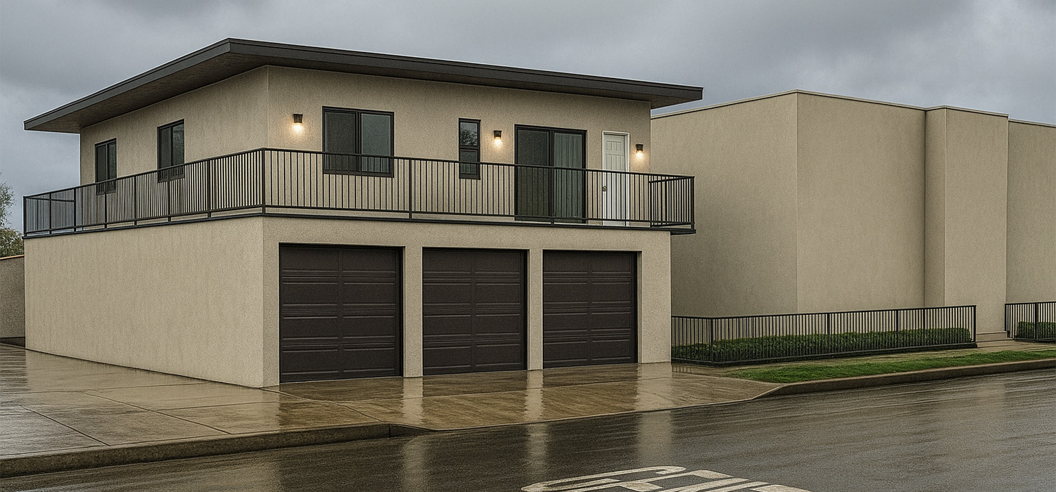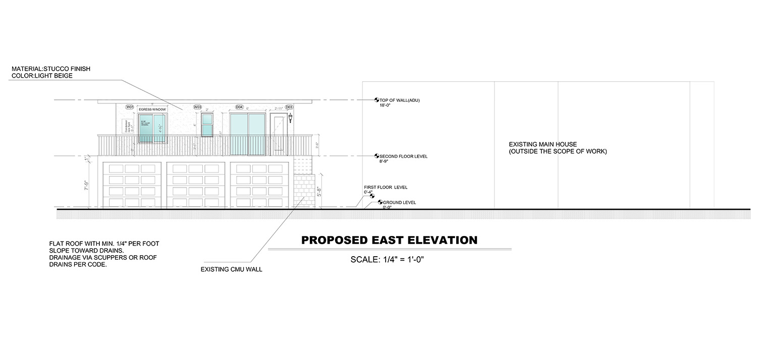 The new ADUs are designed with a stucco exterior finish in a light beige color, giving the structures a clean, warm, and contemporary appearance that blends well with the surrounding neighborhood. Circulation areas, balconies, and green pockets around the ADUs are planned to provide natural light, ventilation, and visual openness.