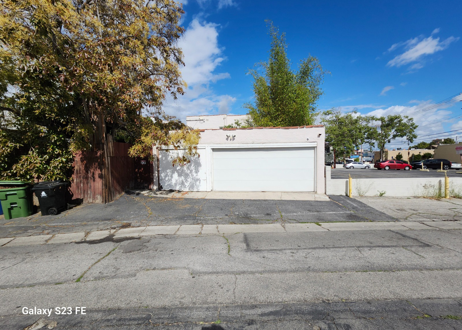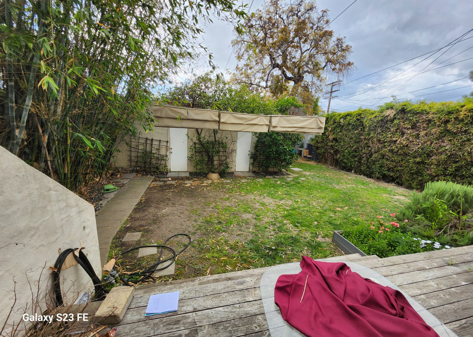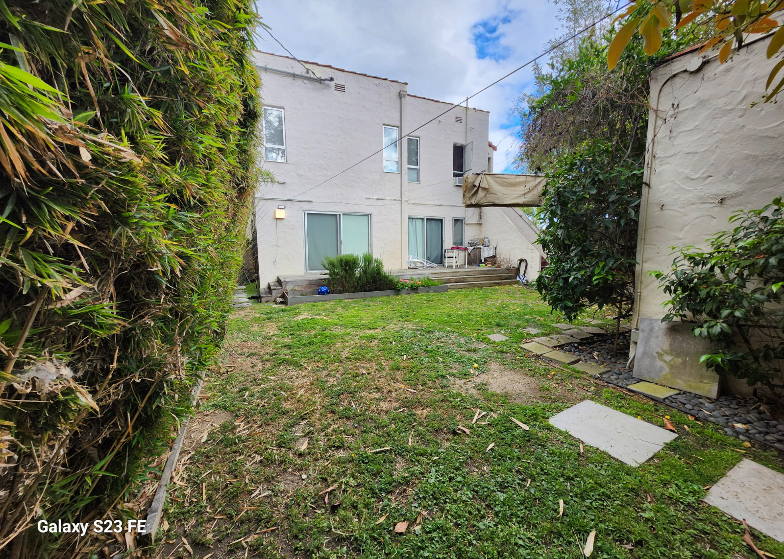 ● Existing landscaping trees, bamboo clusters, and vertical wood fencing is preserved for privacy and character.